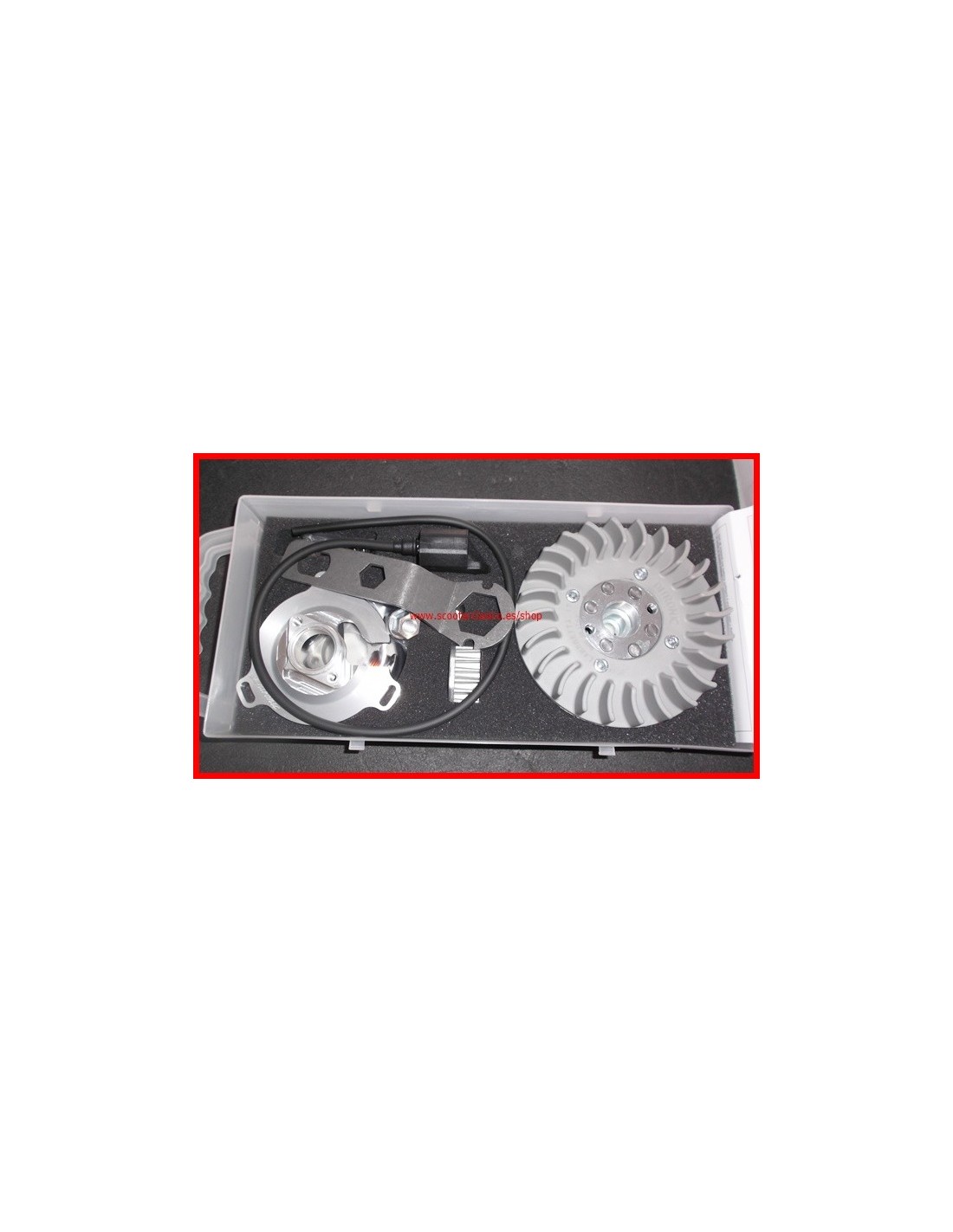 Kit de encendido electronico de la marca Varitronic para Lambretta LD. Para modelos de Lambretta LI/SX/TV. de 12 voltios. Compuesto por stator, volante magnetico, bobina de alta/CDI y regulador de corriente.