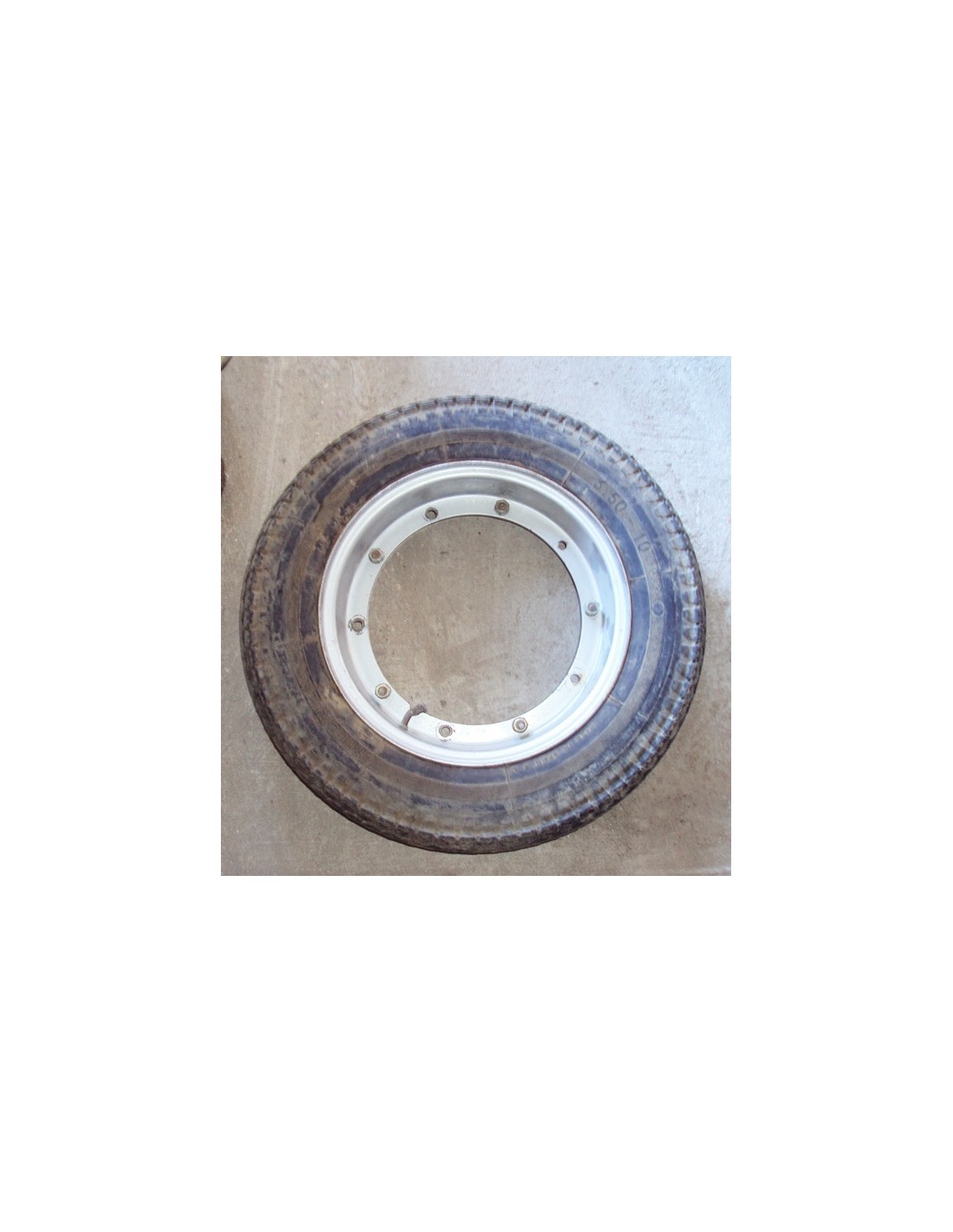 Llanta de segunda mano, con la cubierta A MEDIO USO, de medida 350 x 10, puede ser de la marca MICHELIN, PIRELLI u otra marca, idela para la rueda de repuesto