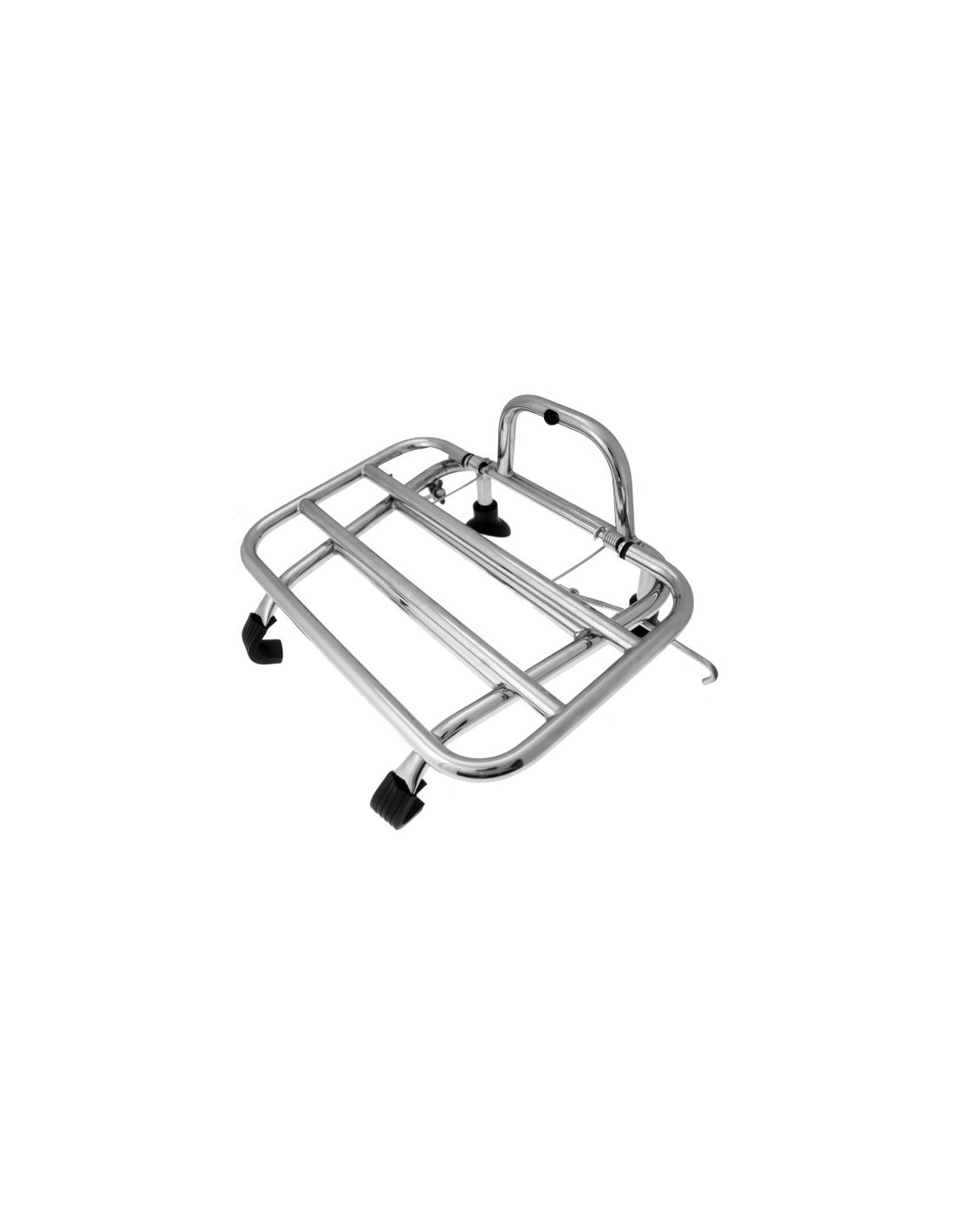 Portabultos delantero cromado de Vespa, este portabultos es un poco más pequeño y sirve para todas las Vespas con la nariz metálica, no se tienen que hacer agujeros, va colgado y luego se apoya con una ventosas ayudandose a sujetarse con unos tirantes
